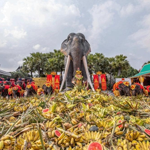 当日是泰国一年一度的大象日,泰国芭堤雅东芭乐园在这一天为大象奉上了丰盛的水果自助餐。