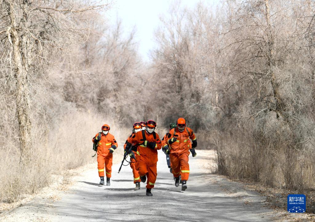 在尉犁县一处胡杨林里,森林草原应急分队成员在进行体能训练(2月22日摄)。