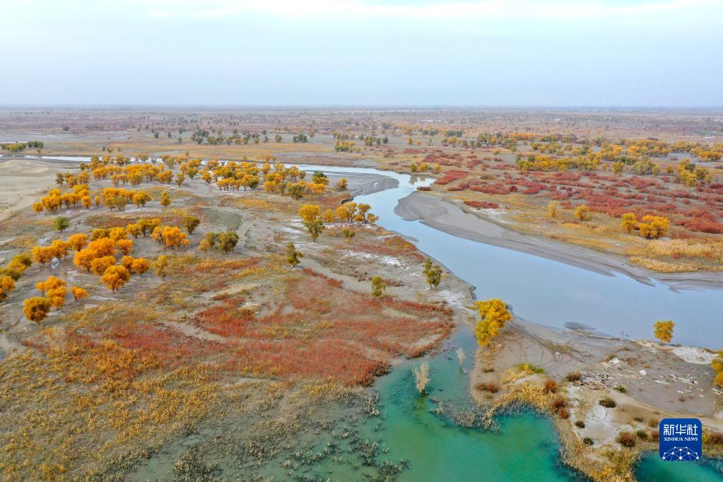 从空中俯瞰塔里木河下游一处胡杨林(2021年10月21日摄,无人机照片)。