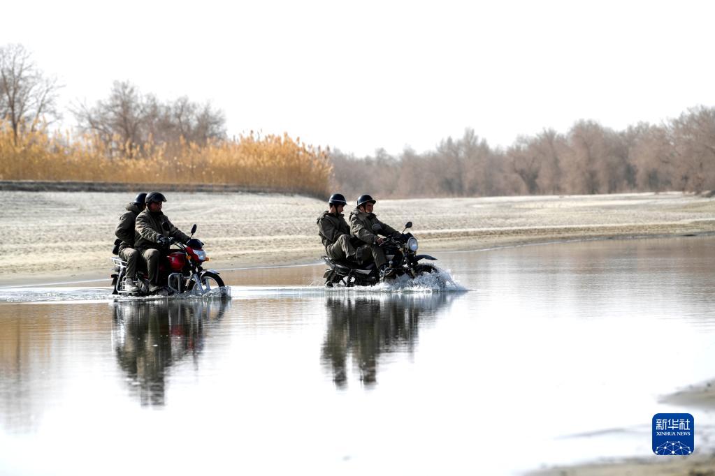 在国家级公益林尉犁县罗湖罗克管护站,护林员骑着摩托车蹚过塔里木河去查看胡杨长势情况(2月22日摄)。