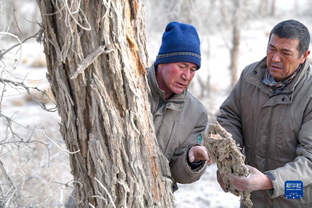 在国家级公益林尉犁县铁曼坡管护站,护林员查看胡杨长势情况(2月20日摄)。