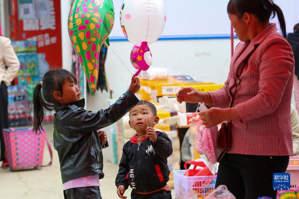 3月11日,在云南省红河哈尼族彝族自治州蒙自市冷泉镇集市,两名小孩对气球爱不释手。