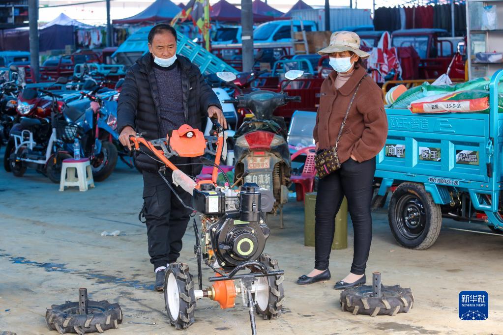 3月11日,在云南省红河哈尼族彝族自治州蒙自市冷泉镇集市,当地农民在农机商店选购小型农机。