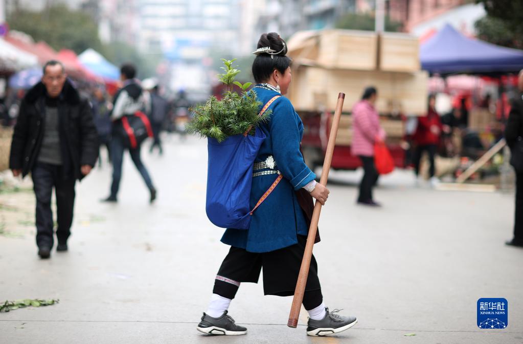 3月10日,在贵州省黔东南苗族侗族自治州丹寨县龙泉镇集市上,一名苗族妇女背着购买的树苗赶集。