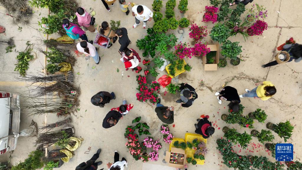 3月12日,人们在贵州省锦屏县三江镇集市上选购苗木(无人机照片)。