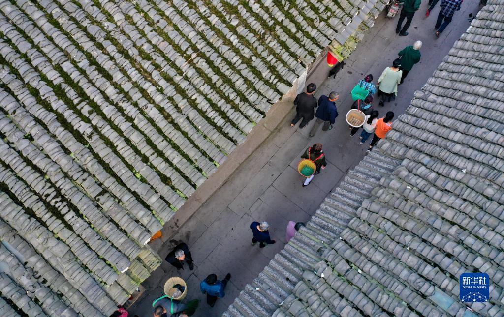 3月13日,购买农用物资的人们走在四川泸州分水岭镇古街小巷(无人机照片)。