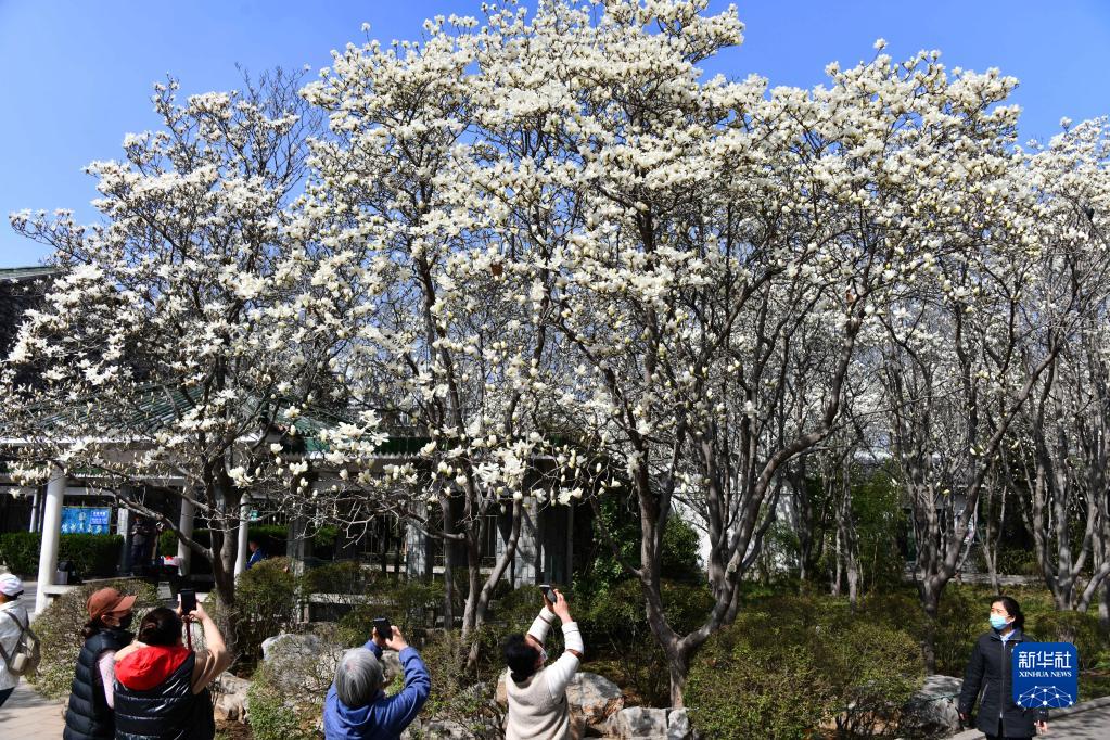 3月14日,游客在山东省济南市百花公园拍摄盛开的玉兰花。