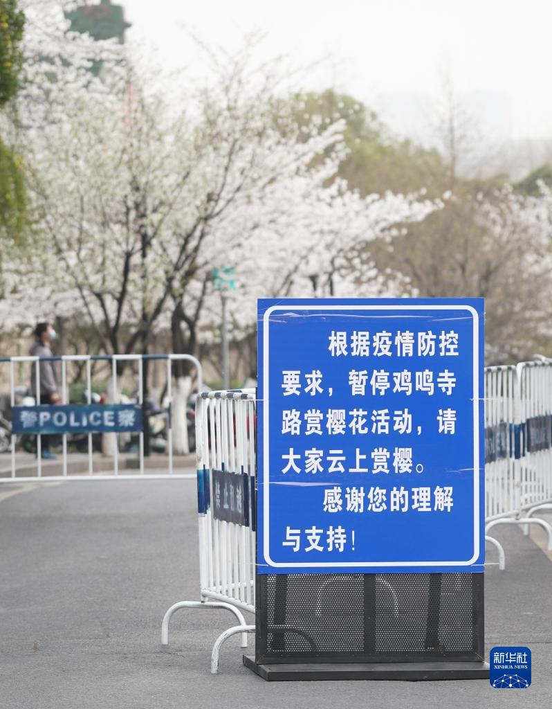 这是南京市鸡鸣寺路赏樱花活动取消的告示牌(3月14日摄)。