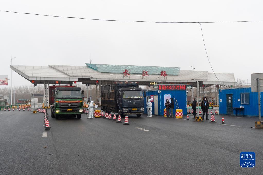 3月14日,在哈尔滨绕城高速公路长江路收费站入口,工作人员对抵返哈人员进行查验。