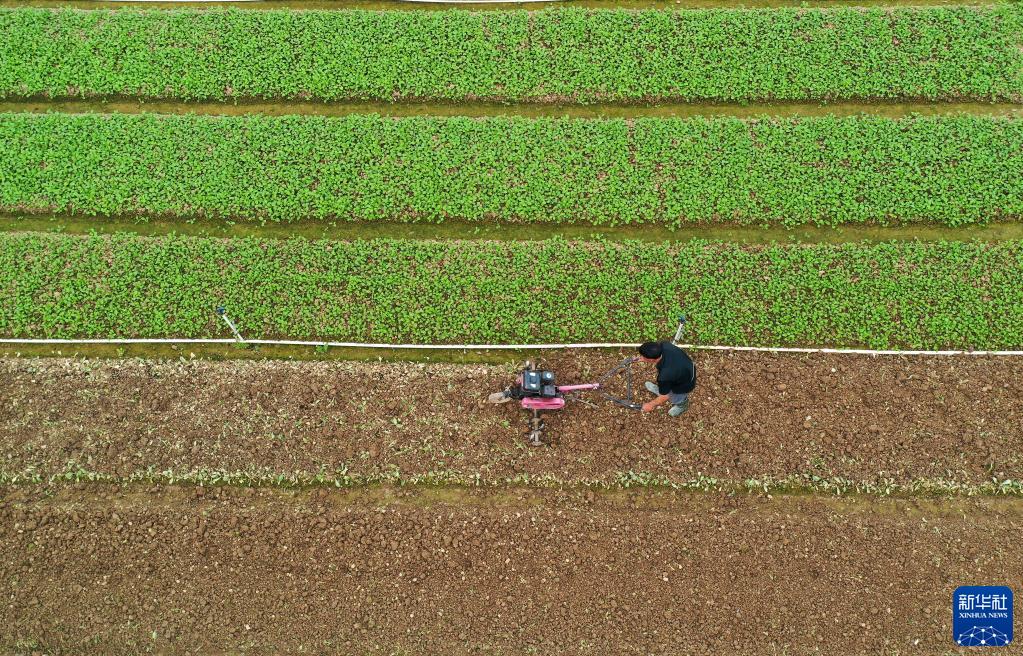 3月14日,在广西南宁市西乡塘区石埠街道下灵村蔬菜基地,农民驾驶农机松土(无人机照片)。