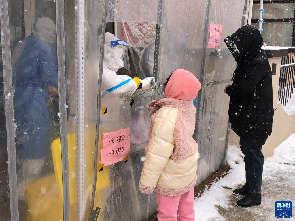 3月15日,在长春市朝阳区镇江路一处核酸检测点,工作人员为居民进行核酸检测采样(手机照片)。