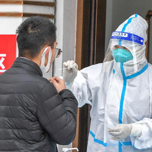 3月15日,在吉林市船营区大东街道一核酸检测采样点,居民排队进行核酸检测采样(无人机照片)。
