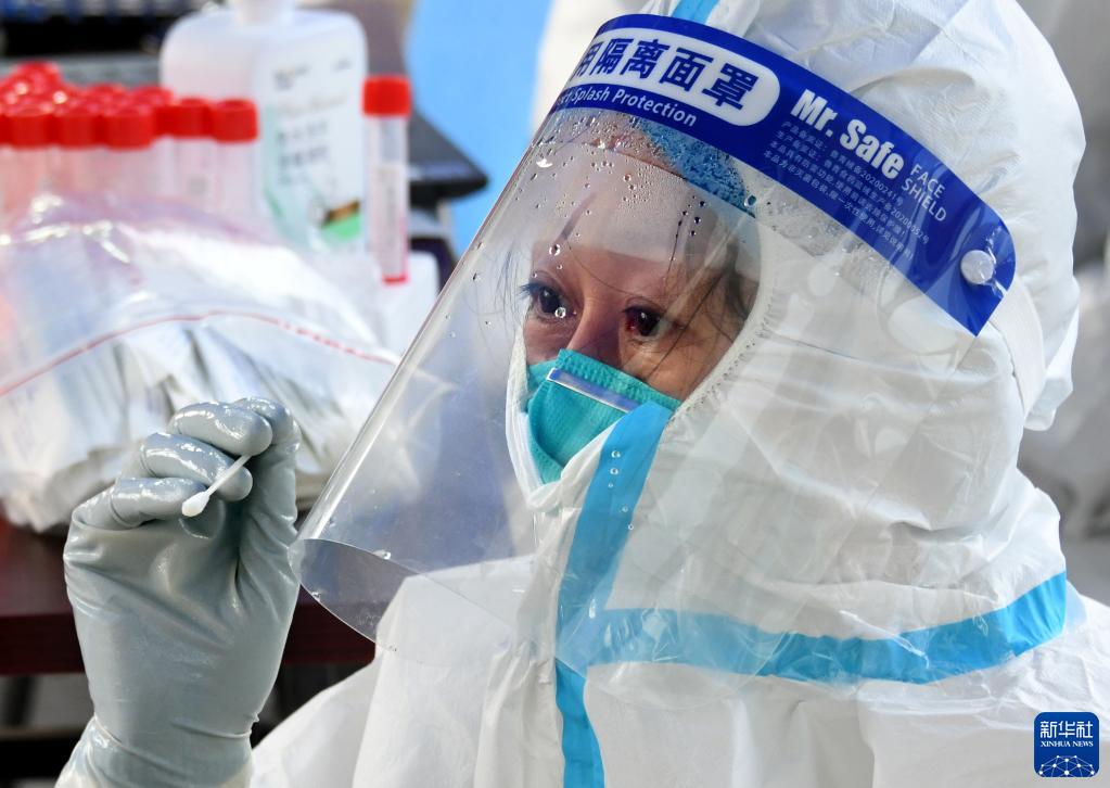 3月15日,青岛市市北区一个核酸检测点的工作人员在为市民采样。