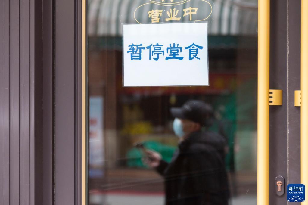 哈尔滨市中央大街一餐厅贴出暂停堂食的通知(3月15日摄)。