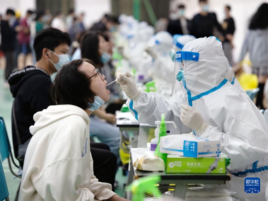 3月14日,香花桥街道社区卫生服务中心的医务人员为某高校的学生进行核酸采样。