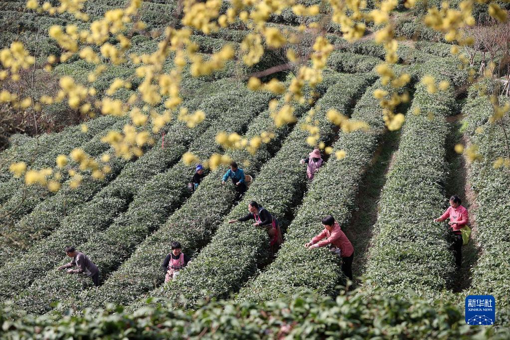 3月15日,村民在贵州省黔东南苗族侗族自治州丹寨县龙泉镇马寨茶园采摘春茶。