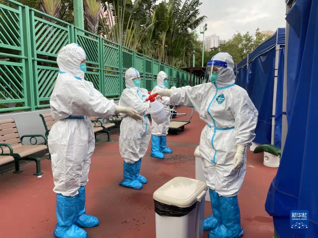 在香港马鞍山游乐场采样站工作的内地援港核酸采样队员互相消毒(资料照片)。