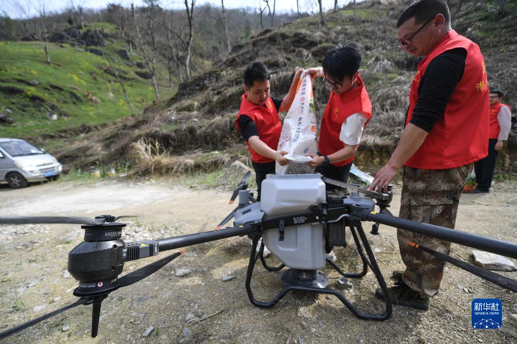 3月16日,党员志愿者在给无人机装肥料,准备给杭州市临安区清凉峰镇九都村生态治理试点林地的套种植物施肥。
