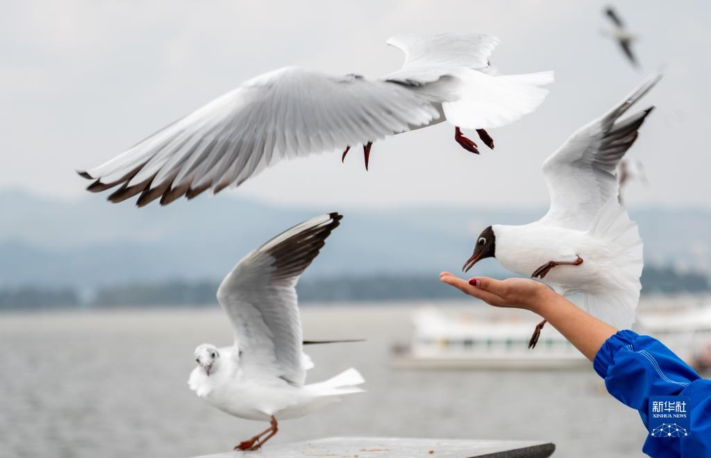 近日,云南省昆明市天气转暖,在春城越冬的红嘴鸥即将启程北往,游人纷纷来到海埂大坝,赏鸥送“友”。