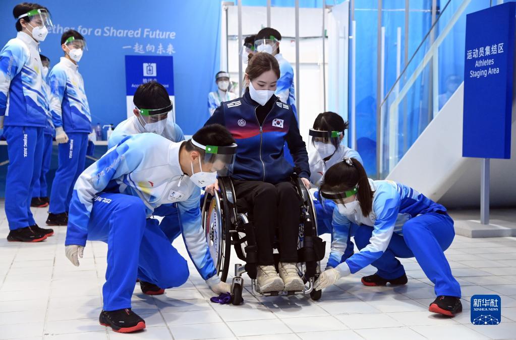 在国家游泳中心“冰立方”举行的北京2022年冬残奥会轮椅冰壶比赛前,志愿者们为韩国选手白慧珍清洁轮椅(2022年3月6日摄)。