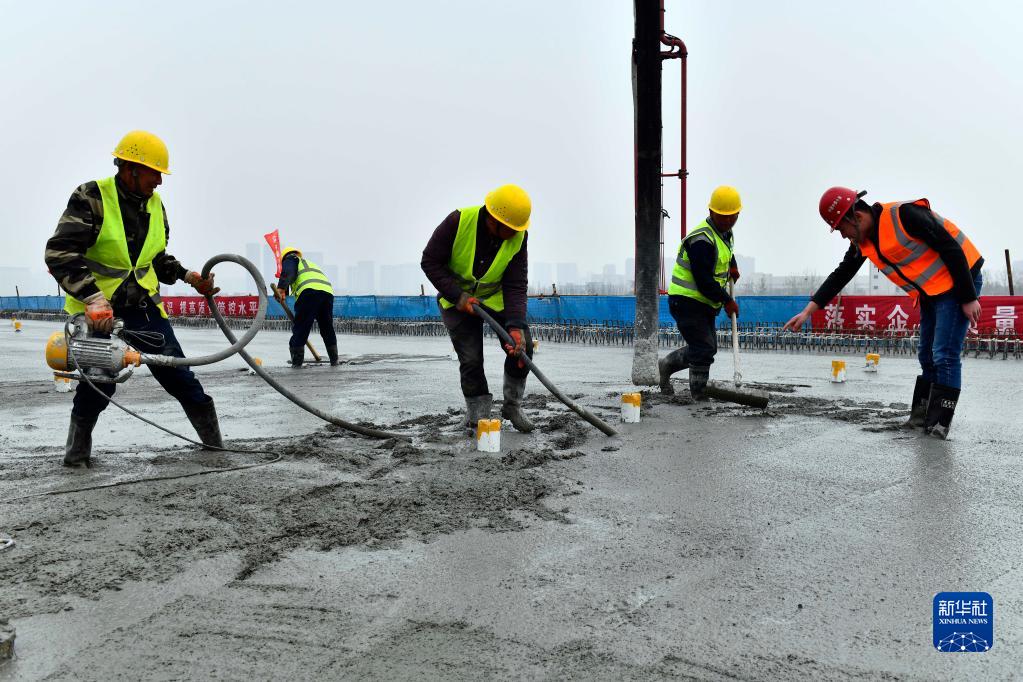 3月16日,中铁十局工作人员在济莱高铁历城站特大桥进行道岔现浇梁浇筑作业。