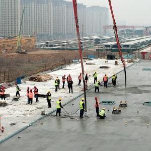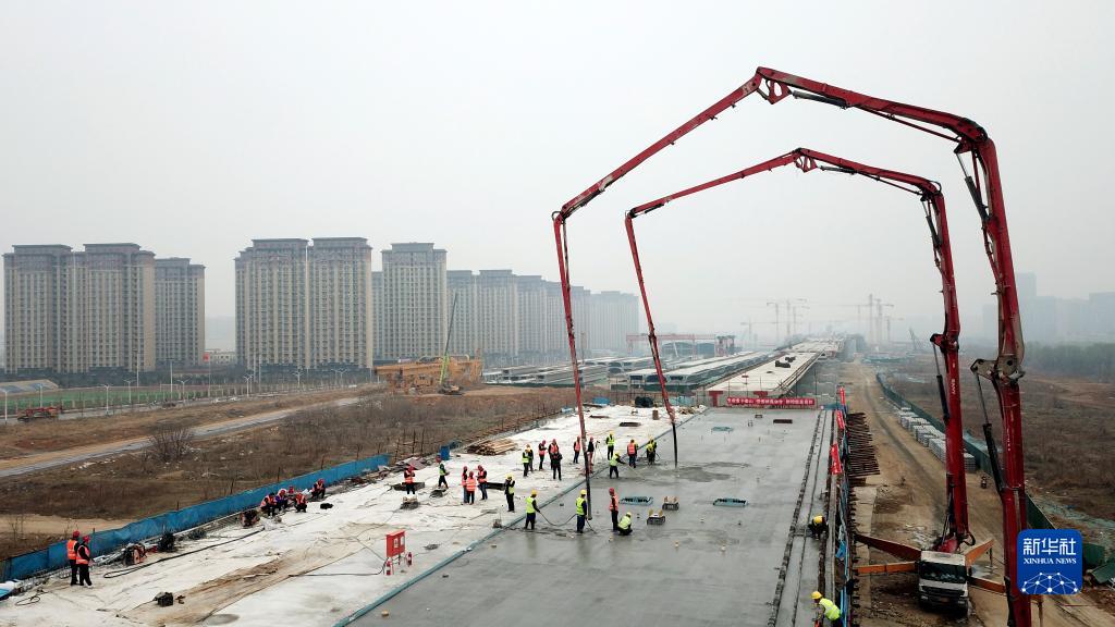 3月16日,中铁十局工作人员在济莱高铁历城站特大桥进行道岔现浇梁浇筑作业(无人机照片)。