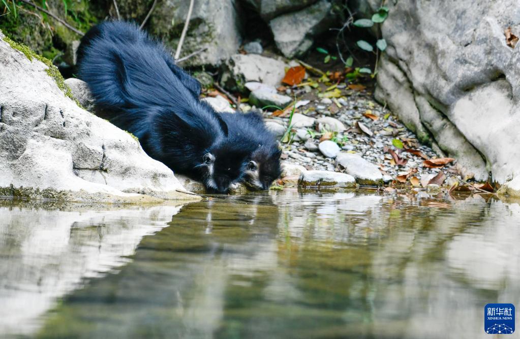 3月15日,在贵州麻阳河国家级自然保护区,黑叶猴在饮水。