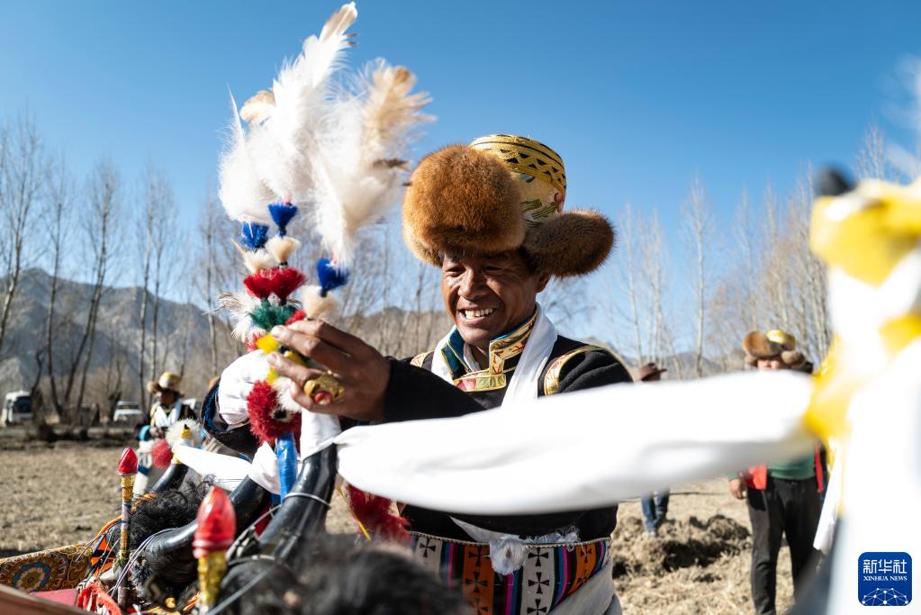 3月16日,村民在西藏拉萨市曲水县茶巴朗村参加春耕仪式时整理农机上的装饰。