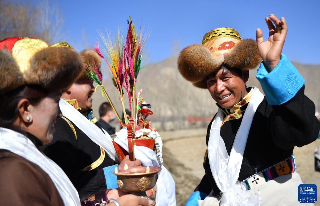 3月16日,村民在西藏拉萨市曲水县茶巴朗村参加春耕仪式。