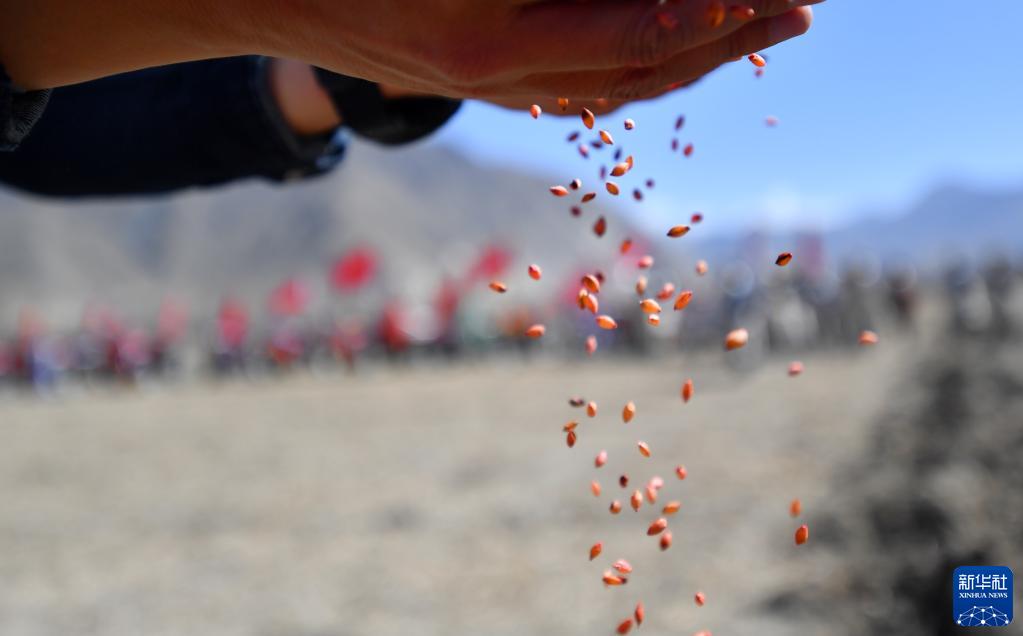 3月16日,村民在西藏拉萨市曲水县茶巴朗村春耕仪式上播撒种子。
