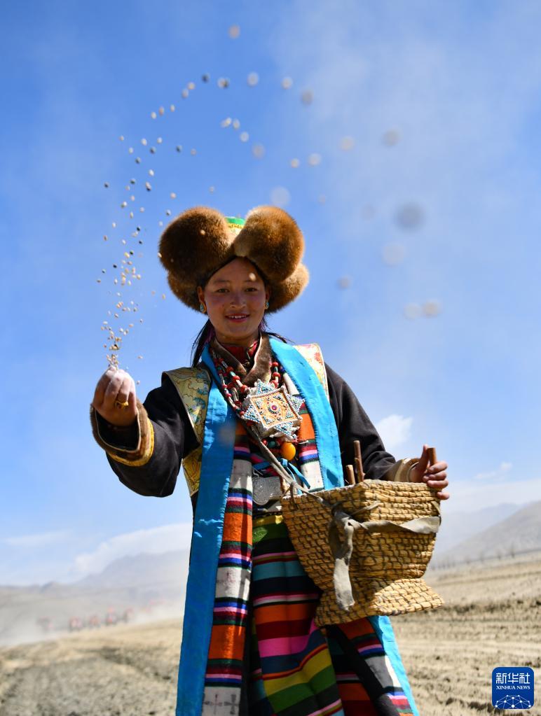 3月16日,村民在西藏日喀则市江孜县努康村参加春耕仪式时播撒种子。