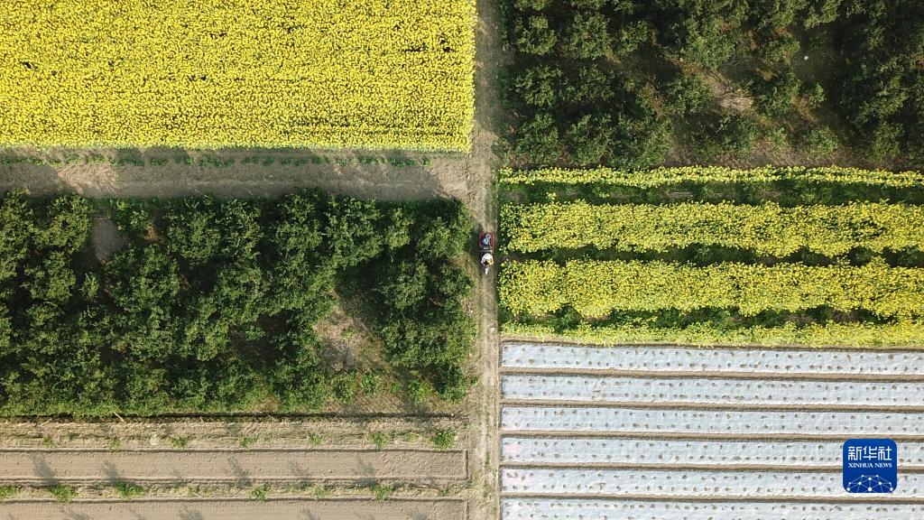 在常德市石门县叶家坪村,叶金娥骑着三轮车在田间穿行(3月15日摄,无人机照片)。