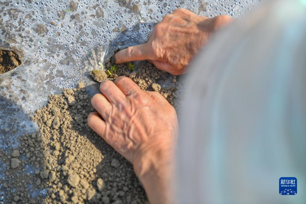 在常德市石门县叶家坪村,叶金娥在查看农作物生长情况(3月15日摄)。