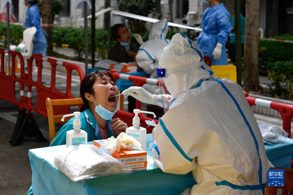 3月17日,深圳市福田区明月花园小区的居民接受核酸检测采样。