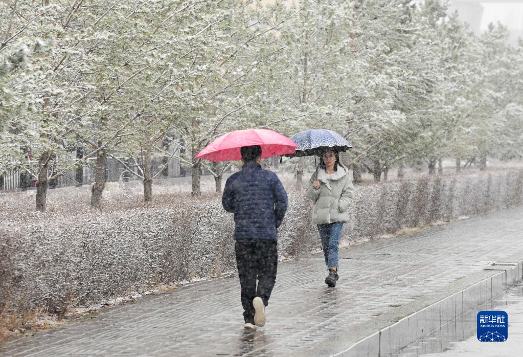 3月17日,市民冒雪在呼和浩特市街头行走。
