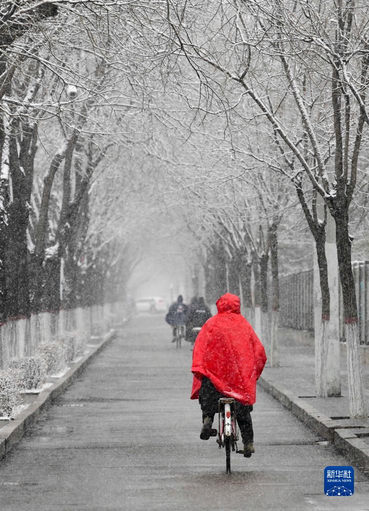 3月17日,市民冒雪在呼和浩特市街头出行。