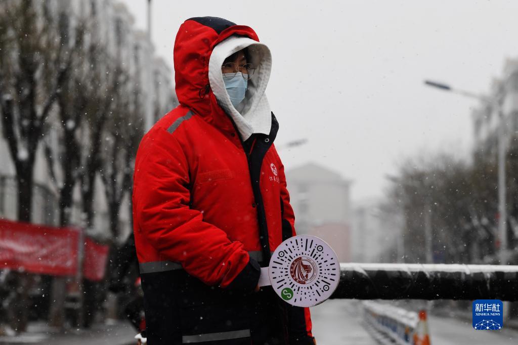 3月17日,在河北省怀来县沙城镇,一名防疫志愿者在雪中值守。