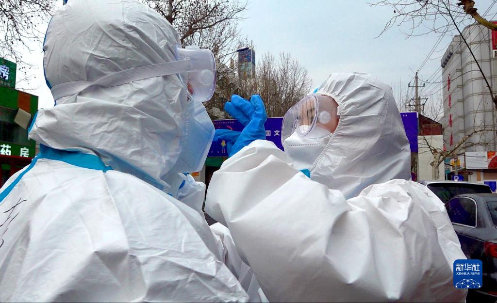 3月12日,山东青岛莱西市“一块帮”青年志愿者互助中心副理事长乔磊(右)在上岗前检查同事的防护措施(视频截图)。