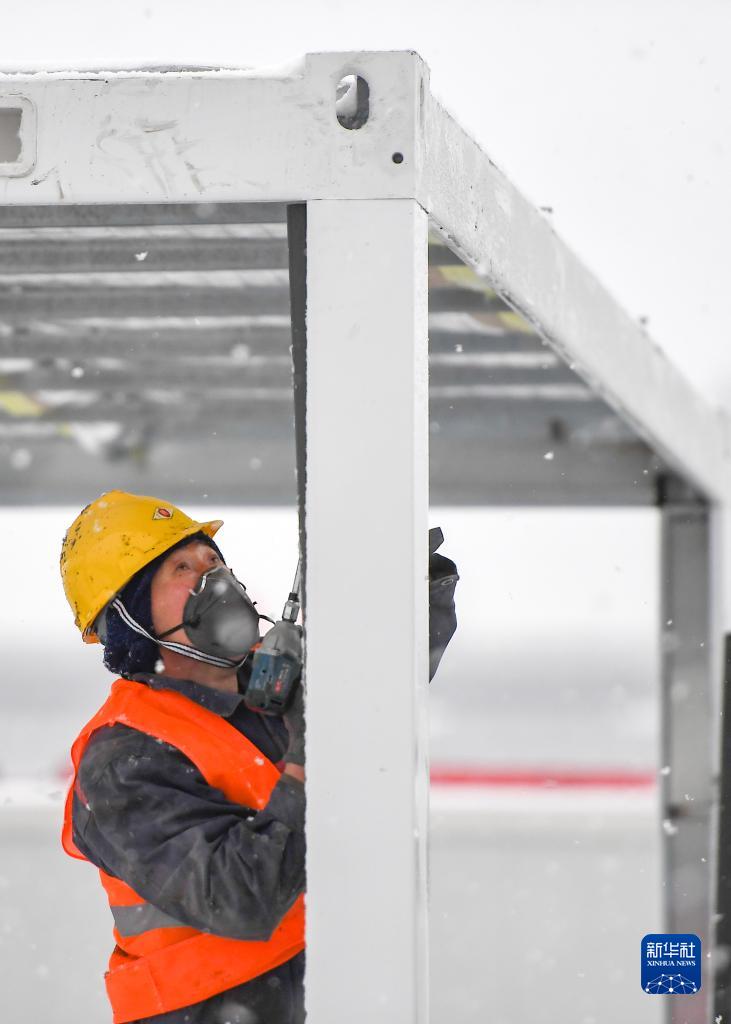 3月15日,工人在吉林市高新南区隔离方舱项目施工现场组装隔离方舱箱体。