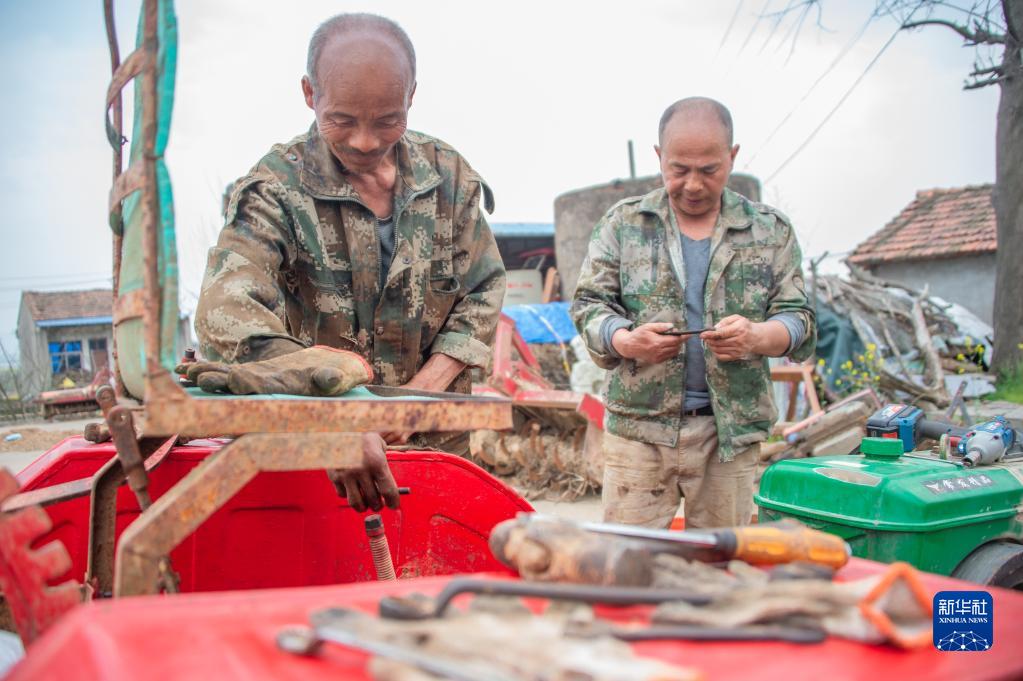 3月16日,在湖北省阳新县祝家庄村,村民鲁飞军(左)和朋友一起修理犁地打田机。
