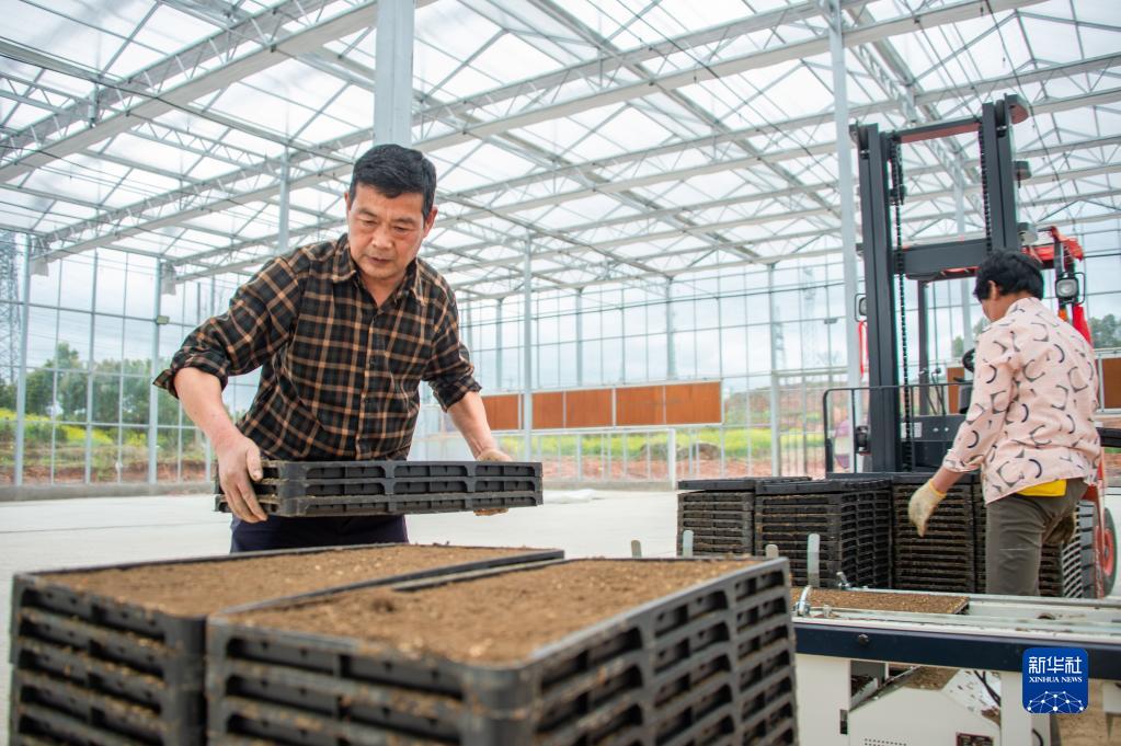 3月17日,在湖北省阳新县水稻蔬菜工厂化智能育秧中心,农民从育秧流水线上取下秧盘。