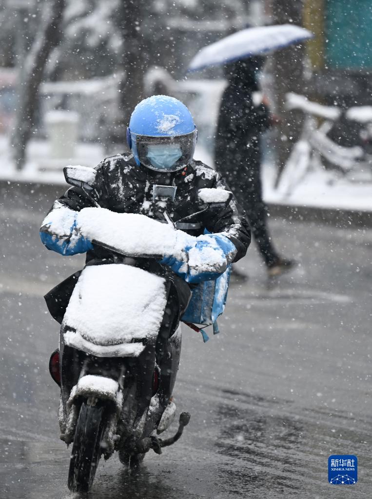 3月18日,外卖送餐员在北京玉渊潭南路冒雪送餐。