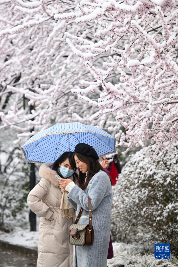 3月18日,游客冒雪在北京玉渊潭公园赏花。