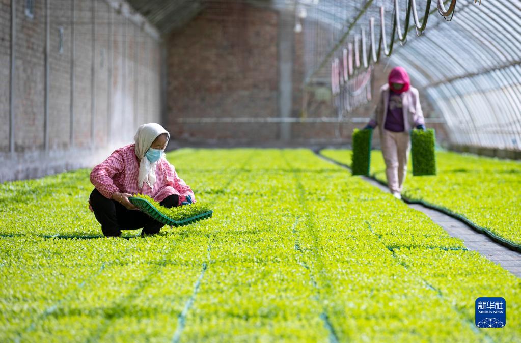 宁夏固原市原州区彭堡镇姚磨村瑞丰蔬菜产销合作社农户在育苗棚内劳作(3月18日摄)。