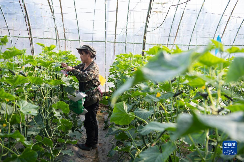 在山西省晋中市榆次区庄子乡西墕村,村民在大棚内管护黄瓜(3月18日摄)。