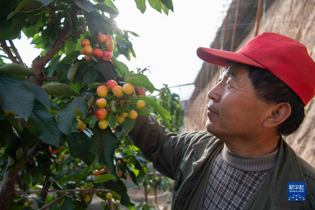 在山西省晋中市榆次区庄子乡西墕村,村民在大棚内查看樱桃长势(3月18日摄)。