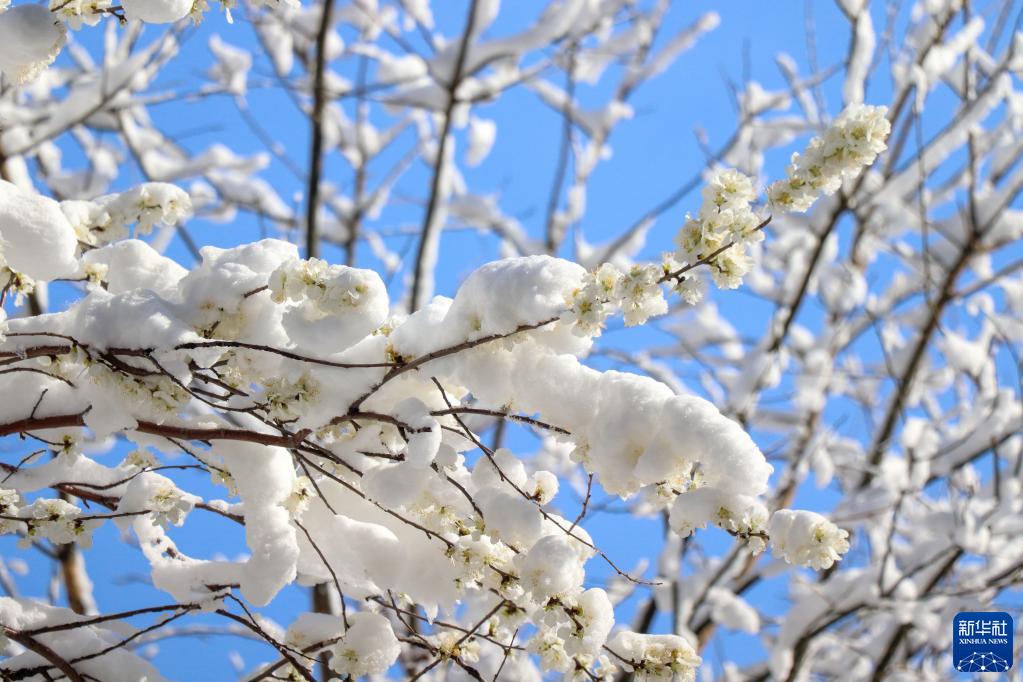 这是3月19日拍摄的覆盖积雪的花枝。3月19日,一场春雪后的天津景色如画。新华社记者 孙凡越 摄