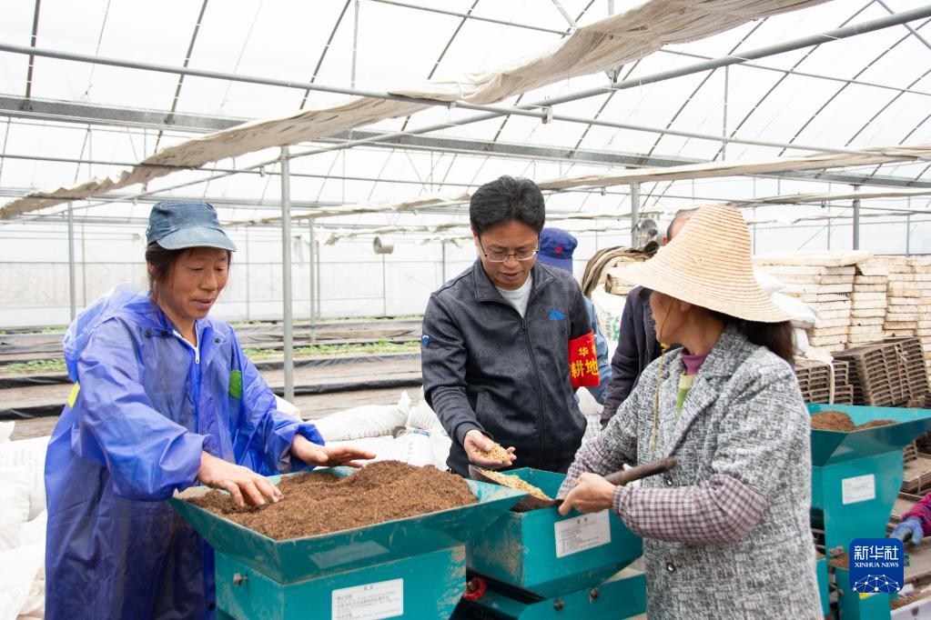 在郴州市北湖区华塘镇三合村,王元和(左二)在育秧大棚内查看早稻育种情况(3月18日摄)。新华社记者 柳王敏 摄
