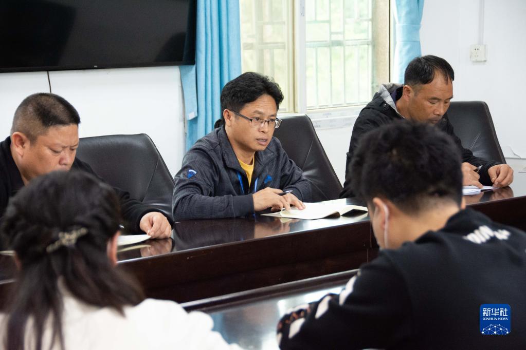 在郴州市北湖区华塘镇三合村,王元和(中)和村干部以及村民代表商量如何保护耕地(3月17日摄)。新华社记者 柳王敏 摄