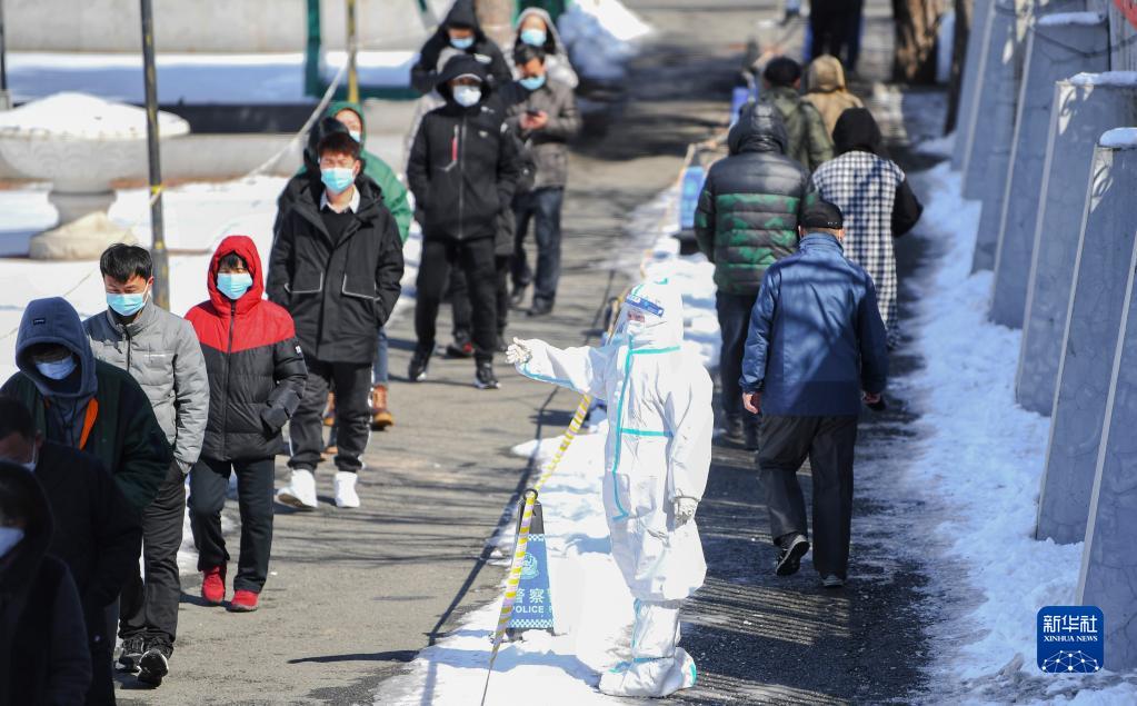3月19日,在长春市一处核酸检测点,市民在工作人员的指引下有序排队等待接受核酸采样。新华社发(张扬 摄)